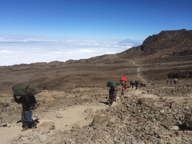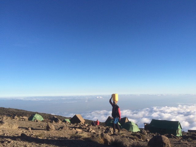 One of the wildest parts about being on Kilimanjaro is water consumption. If you are taking Diamox (prescription anti-altitidue sickness drug), you will be peeing constantly. The solution is to drink 4 liters of water per day, plus tea or coffee, and soups. In some of the lower camps, there are nearby streams, but at a certain point on the mountain, water is no longer easy to get. The porters carry 5 gallon (20 liter) containers on their heads to bring water up and down the mountain. At the longest stretches, they have to go 4 or 5 mountain miles each way to get the water. Yes, on the uphill part of the hike, the water containers are full.