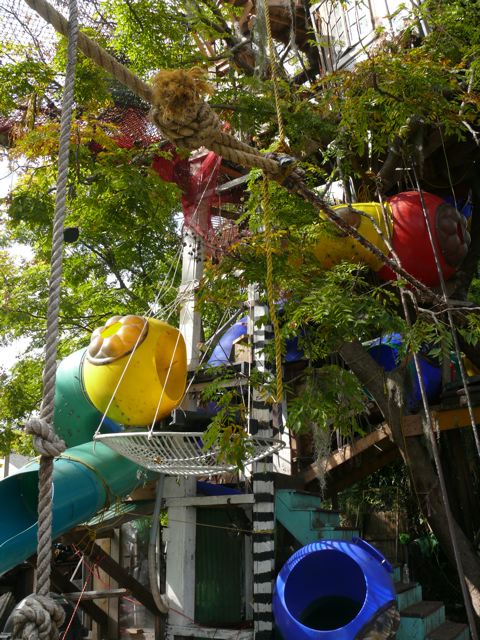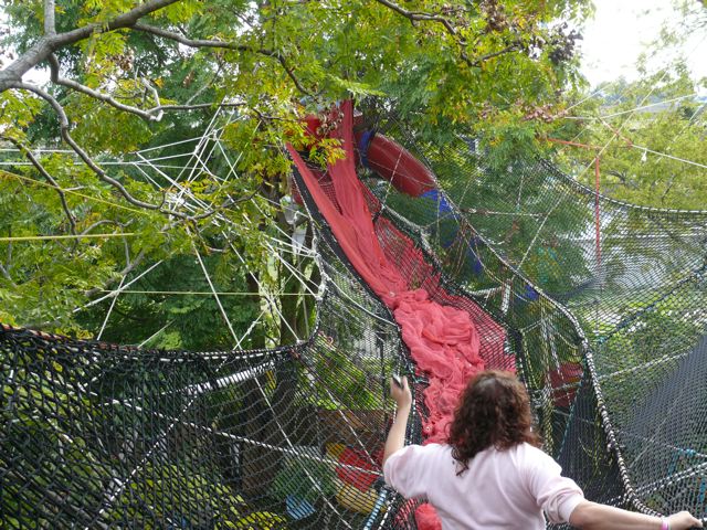 Most of the materials used in the making of the treehouse are recycled and some are just straight-up Katrina leftovers. These huge nets that make up the hammock bridge are salvaged from batting cages and golf driving ranges.