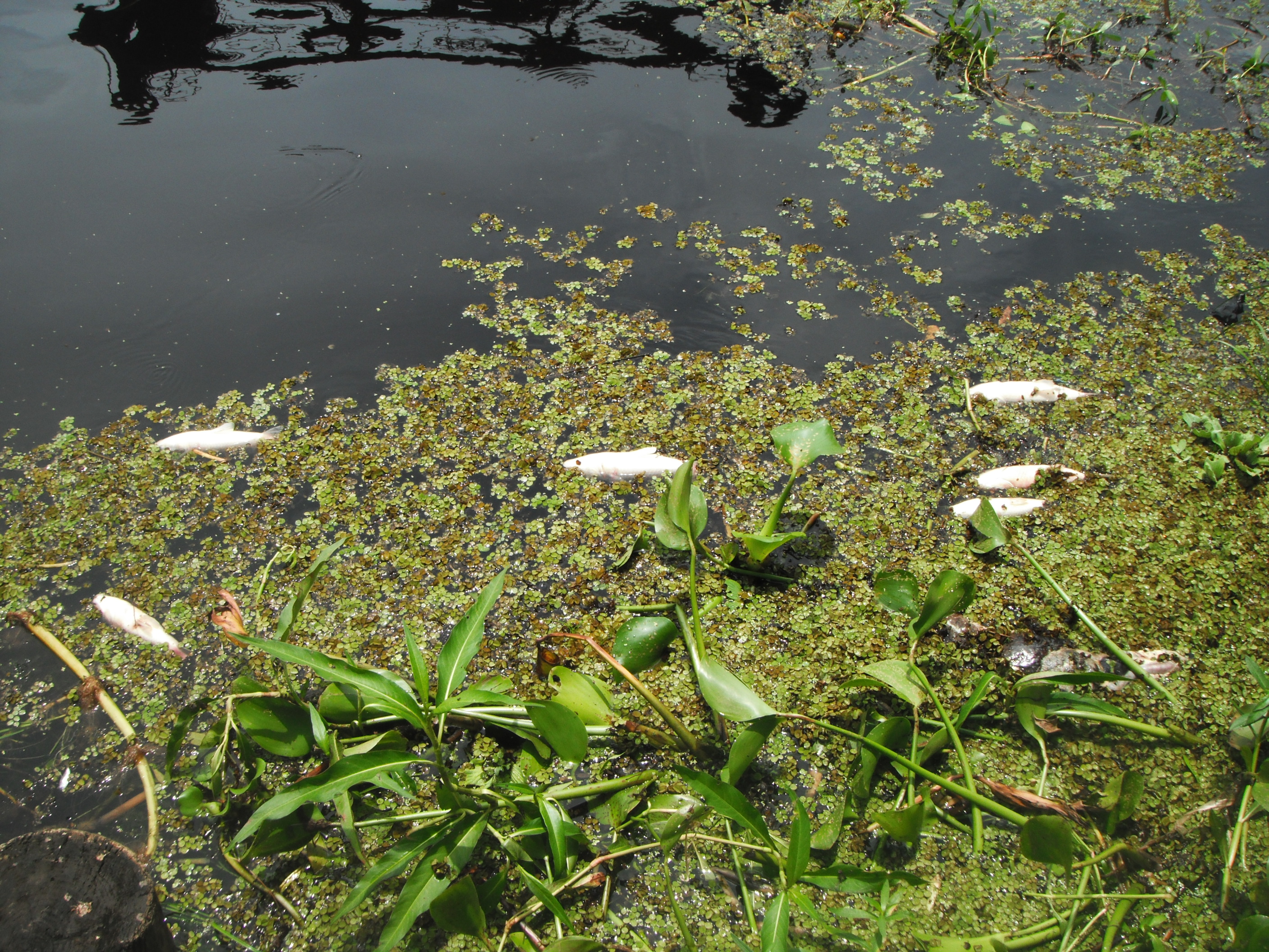 Diego is correct. Every time the water levels get high and plenty water enters the swamps, when the water drops again there is always a fish kill. What happens the organic rich water smothers the fish. Oxygen levels go down and plenty of time an algea bloom happens. i fish there every week and there is no oil there. Way to far inland for oil. Fish kills are a natural part of the bayous.