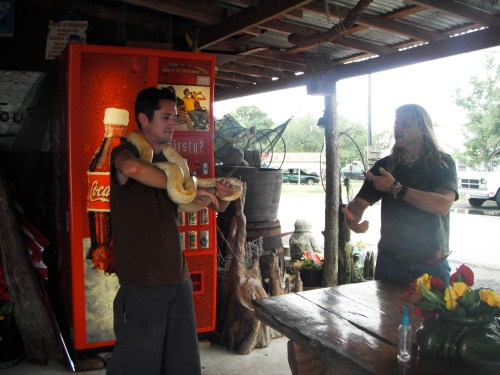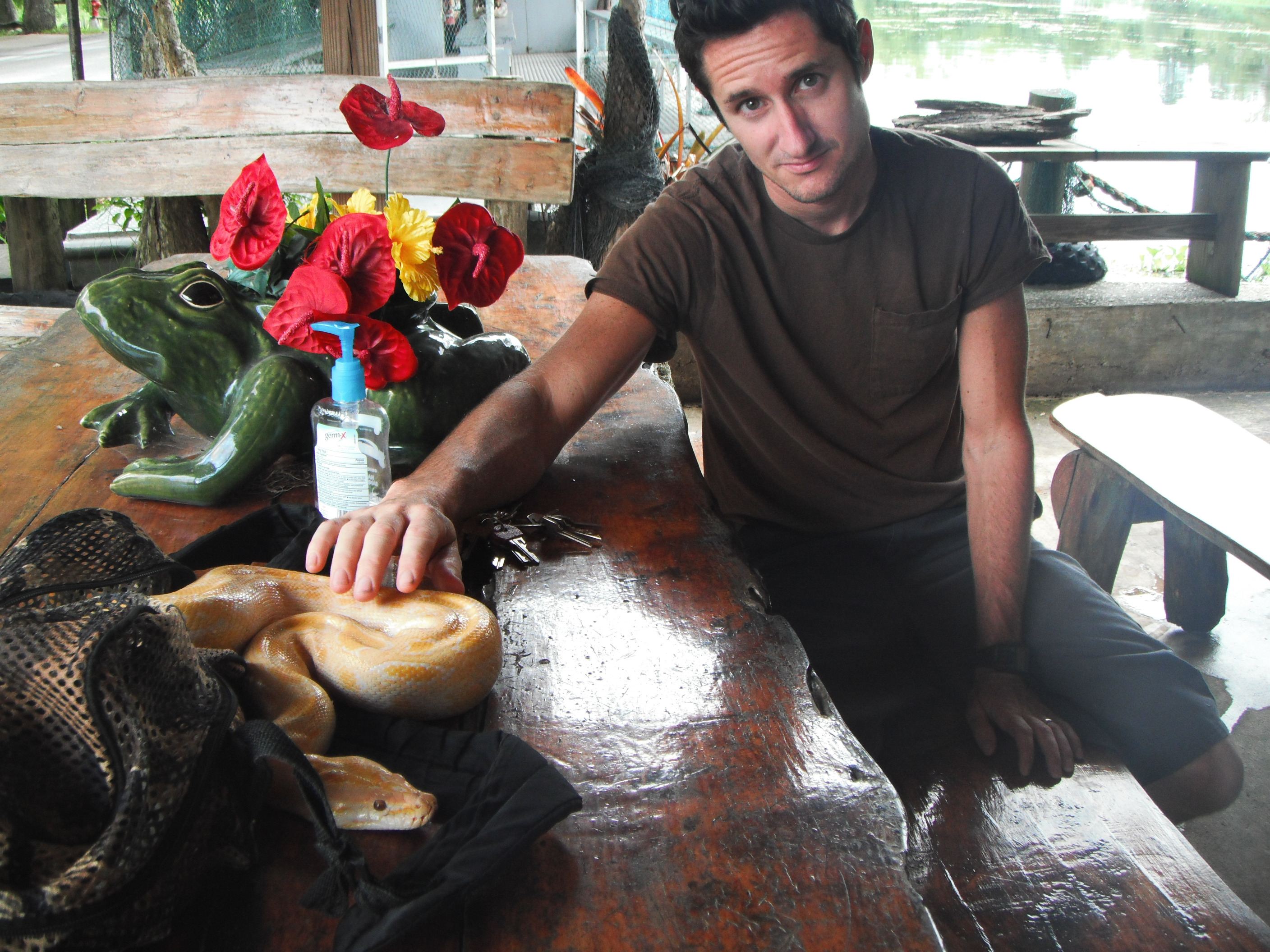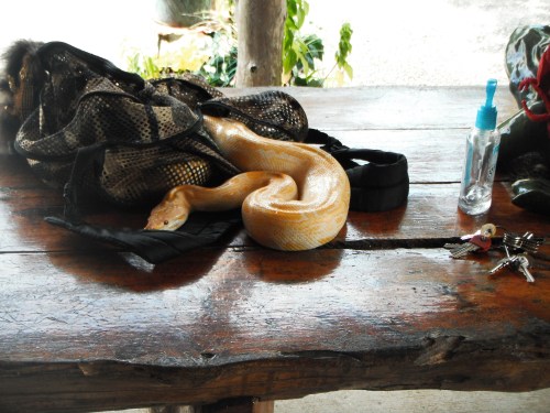 We went back on the porch and noticed that Diego had left his keys, a bottle of germ-x, and an unattended backpack on a picnic table with a live python in it.
