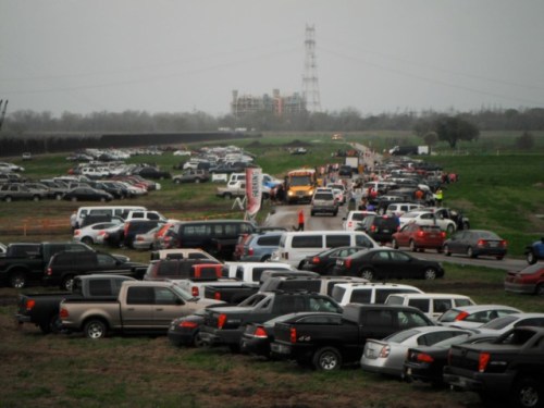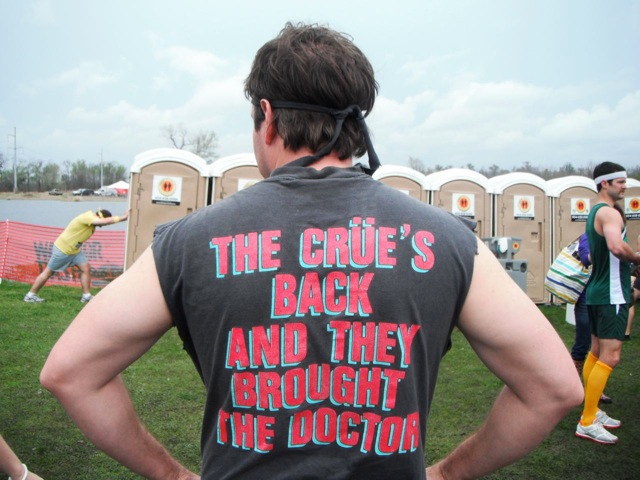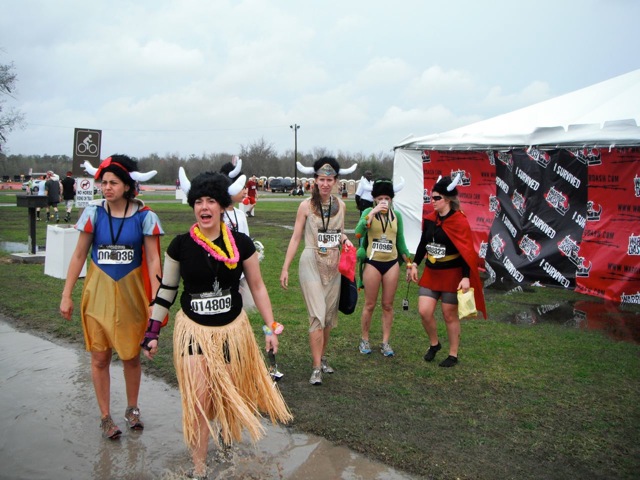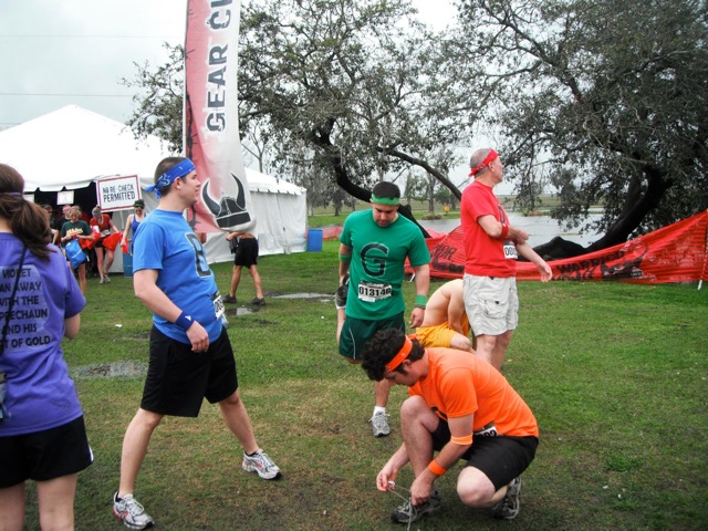 Then, the plug was pulled on the music and people started shuffling to the buses in the rain. The weather was indeed picking up. After looking at the immense crowd waiting for buses, we opted(as did many) to walk the 2 miles to parking in the rain with our giant beers. Those of us who walked enjoyed a post-race glow and we entertained each other through stories and song. It was still Mardi Gras weekend; weather does not inhibit people with giant beers who run in mud.