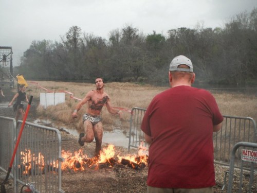 Finally, last weekend, WARRIOR DASH became a reality. Although the weather looked glum with a 100% chance of rain and a Tornado Warning, we still got there early, determined to race and have a fun. I couldn’t believe the turnout – thousands of people(mostly from New Orleans and Baton Rouge metro areas) had paid money to participate in a hellish muddy run through deep water, tunnels, 20′ high cargo nets, barbed wire, and of course… the fire leap.
