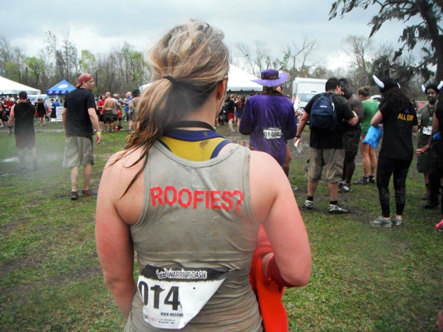 After checking in, we were informed that the weather situation was “no fucking joke” and the whole Warrior Dash was threatened to be canceled for participant and worker safety. With tornados and a huge storm approaching, the race officials had begun sending groups of racers through every 10 minutes instead of the originally planned 30 minute waves. Not wanting to get left out, we scrambled to the start gate and awaited the pyrotechnic explosion that would signify the start of our race. Inside the starting gate, I saw there were plenty of “team” entrants who all dressed in a theme with identical or similar outfits. These guys’ theme was the word “awesome.”