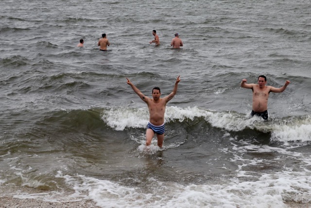 We convened in the parking lot by the “tailgates” of our vehicles in the same way that fanatics of professional football contests are known to do. Before the celebration ritual, we consumed icy cold suds that bore a semblance to the frothy winter sea in which we would soon be baptized.