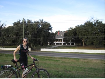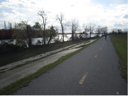 Today Noelle and I decided to bike west on the Mississippi River Trail to the Destrehan Plantation. We didn’t have all day, so we drove to the Kenner airport and parked in one of the neighborhoods below it. These houses are right on the river and the streets dead end into the levee. After pushing our bikes up the grassy hill, we were greeted with pleasantly smooth blacktop. I instantly wondered if it would be good for skating and wished I had brought my longboard with me. Oh well, another day.