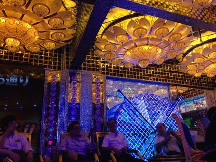 more LED lights than I have ever seen, mirror, mosaic tiles and screens of animation