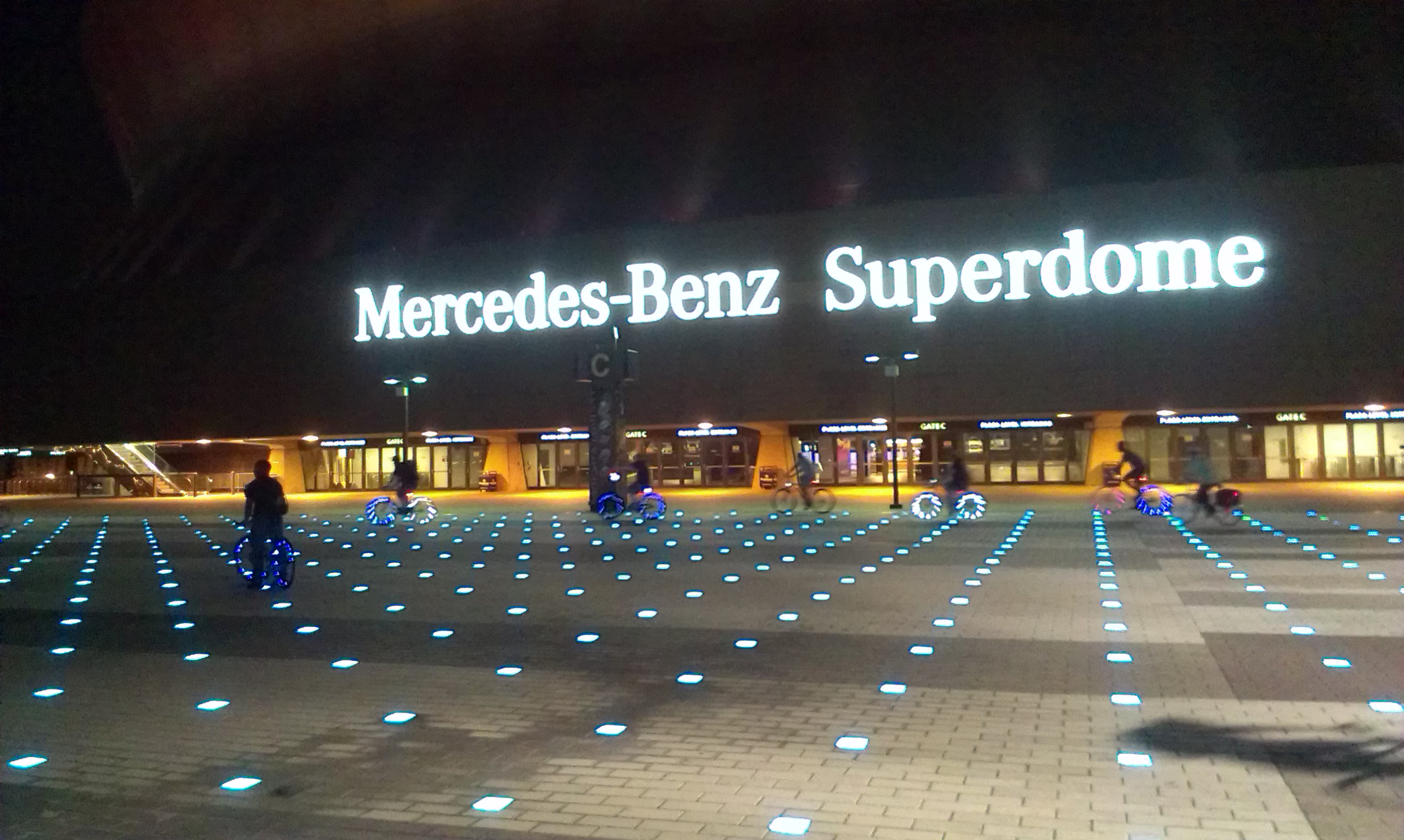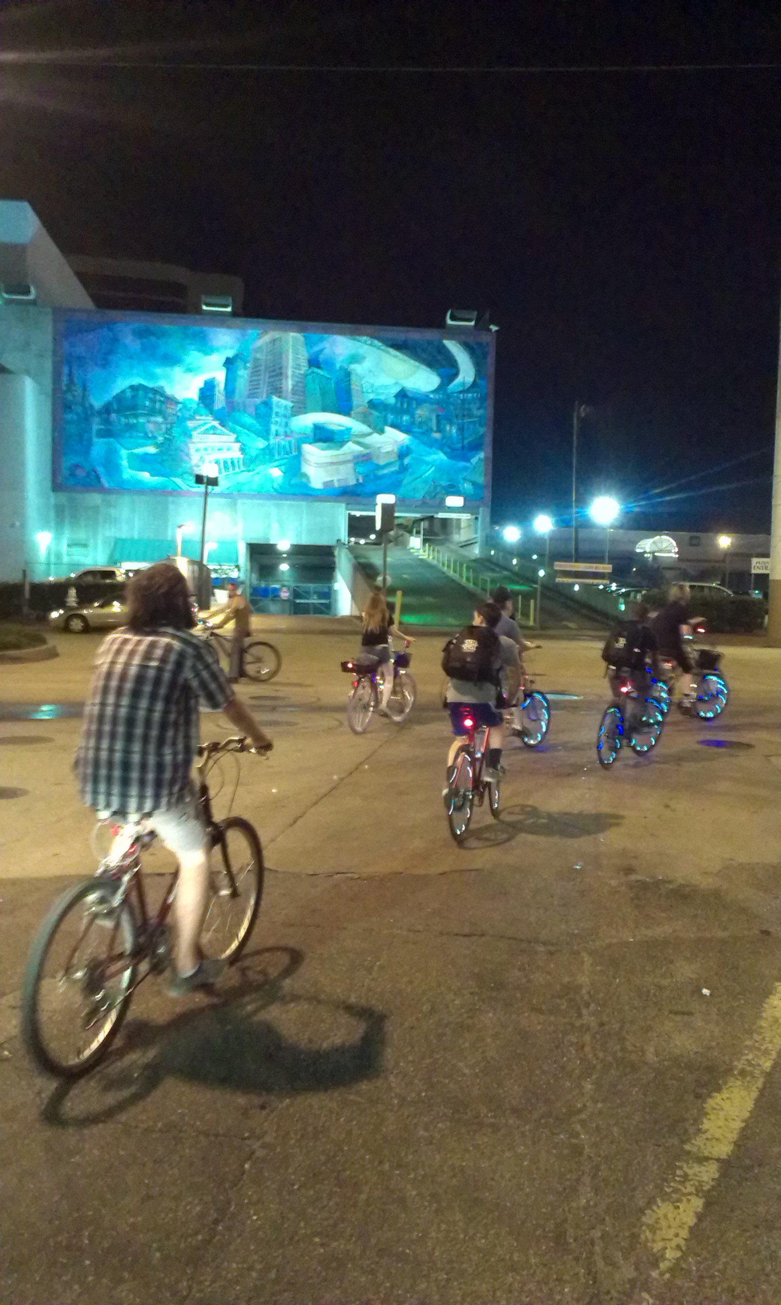 So far I’ve discovered the swinging benches under the Crescent City Connection, biked directly into the Blaine Kerns Warehouse after dark (who left that open?) for my own private tour, discovered hidden pathways in Mid-City, circled the Super Dome, and explored the golf courses after dark. Above all, my favorite is seeing people’s faces when a giant group of costumed bikers pass them, wishing them a “Happy Thursday!”