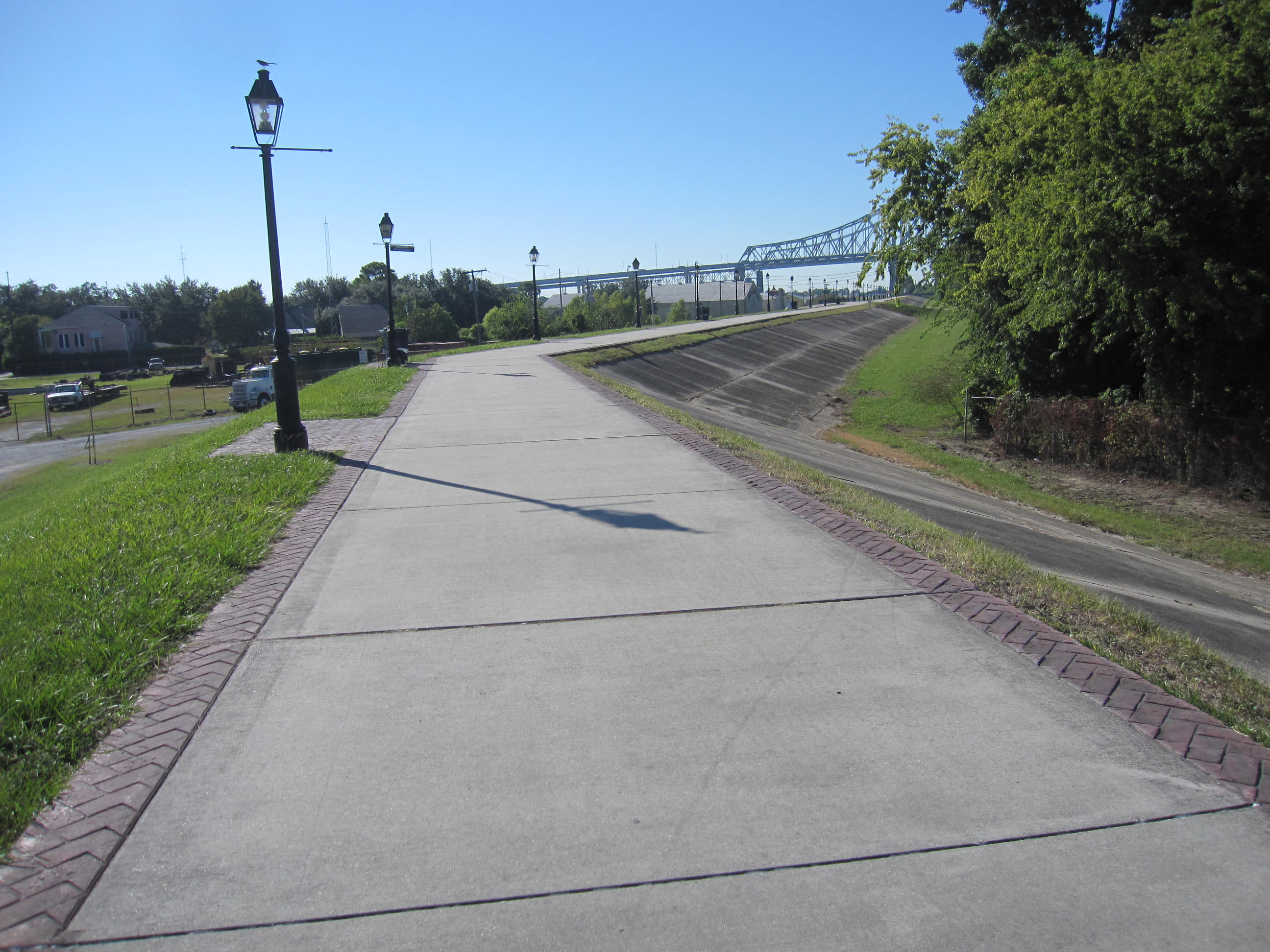Peddling on the smooth asphalt of the levee is a treat, especially if you’re familiar with the potholes and ragged conditions of the roads here. On your 5 mile journey, you will go under the Crescent City Connection Bridge. It’s an awesome structure when you see it from this perspective.